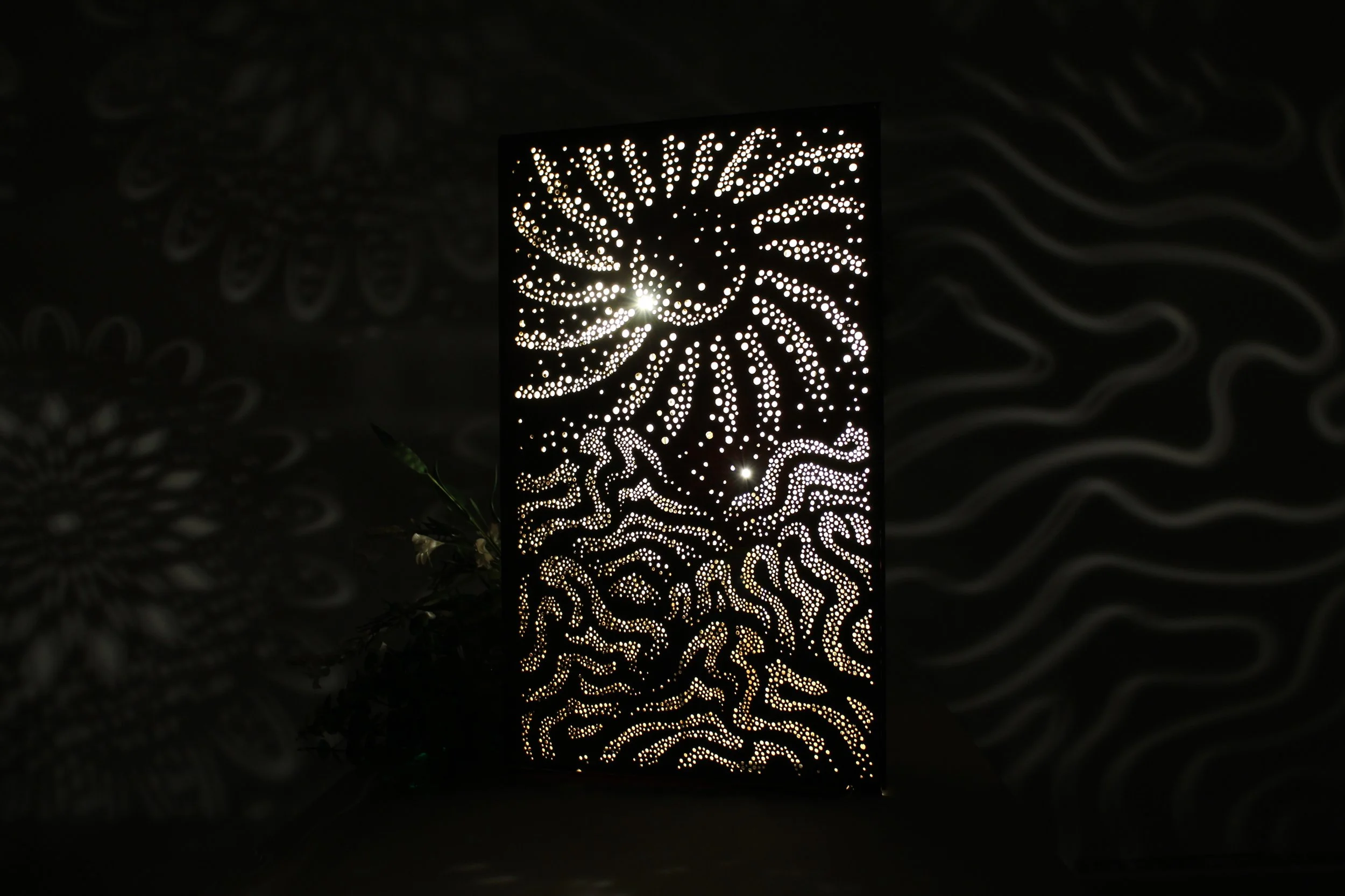 it reminds us of the connection we have with the world around us. As humans, we are naturally drawn to nature's patterns, finding balance and a sense of tranquility. Exposure to these natural patterns can result in calmness and reduced stress, which is why my exhibition embodies this sense of peace of those who walk through. I allow the light from my pieces to overlap and intertwine, representing the interconnectedness between humanity and the natural world, and the relationship we share with our environment, even within the confines of indoor spaces.
