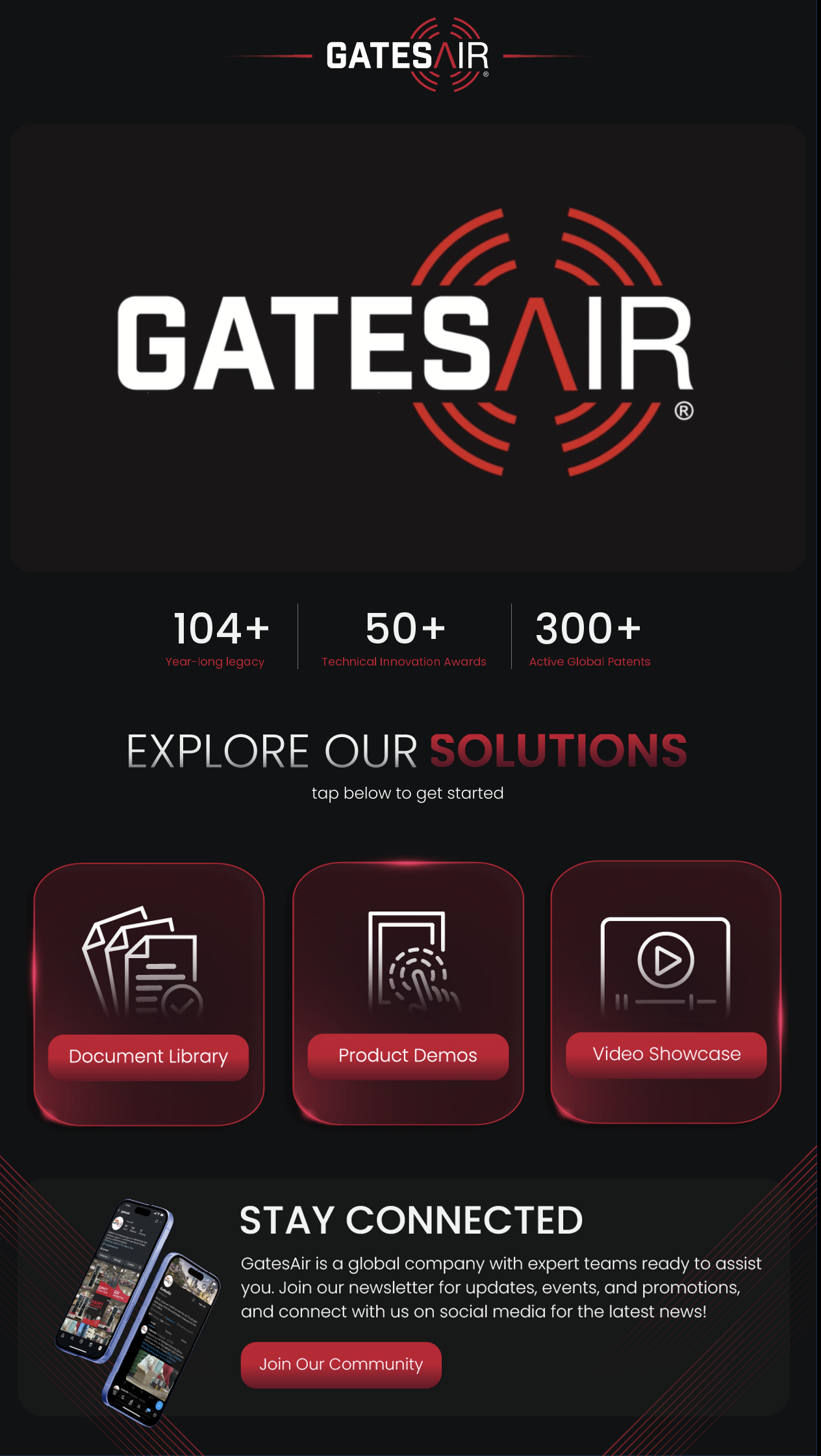 For the table inserts, I developed the initial design and added a QR code linking to a webpage featuring the products displayed at the booth. The webpage includes a printable PDF for additional information, and each product links directly to its page on the GatesAir website, giving attendees easy access to detailed product information.